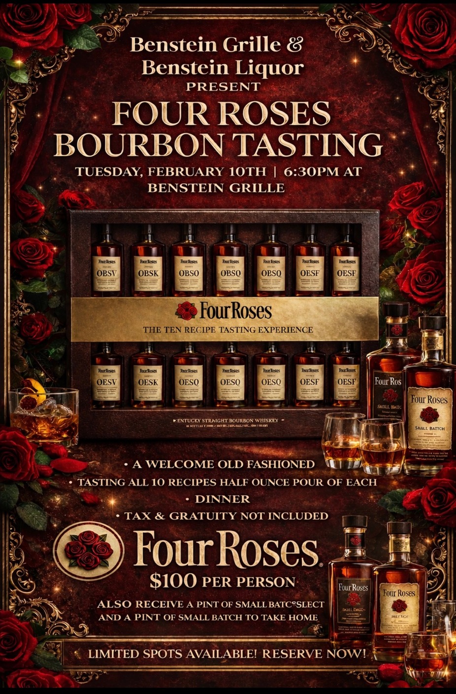 We’re teaming up with Benstein Liquor to bring you an exclusive Four Roses Bourbon Tasting—an elevated, intimate experience for bourbon lovers.